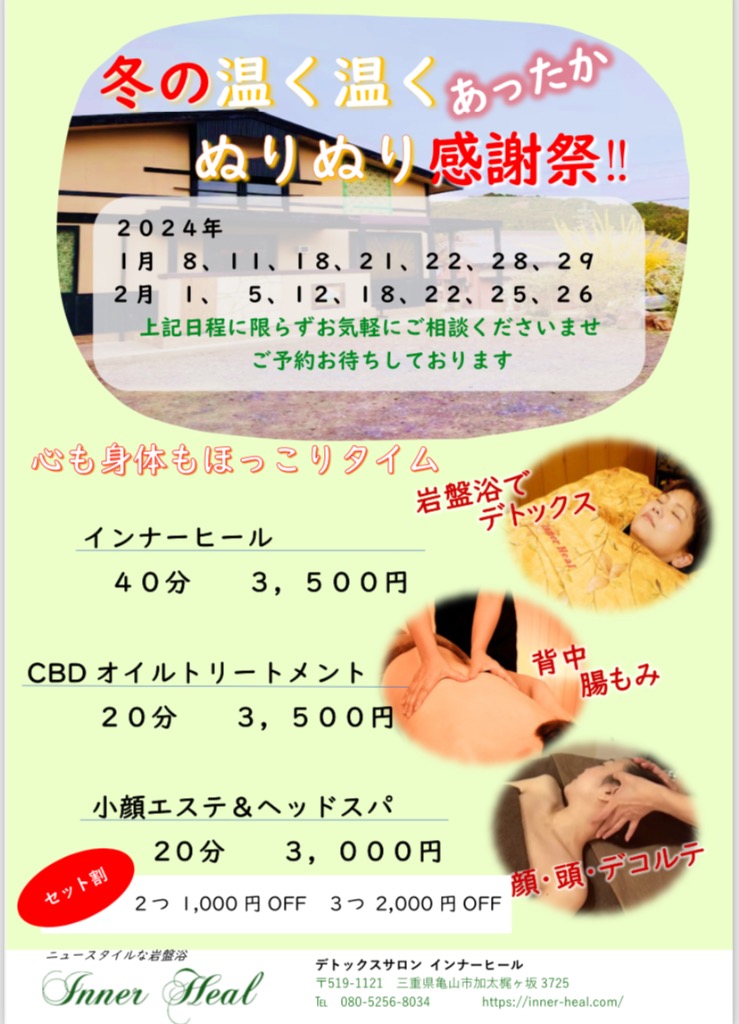 小雪がちらつく寒い中、ファスティングメンバーさんがご来店くださり、インナーヒール岩盤浴とCBDトリートメントのエステの施術もご堪能されリフレッシュされていきました。