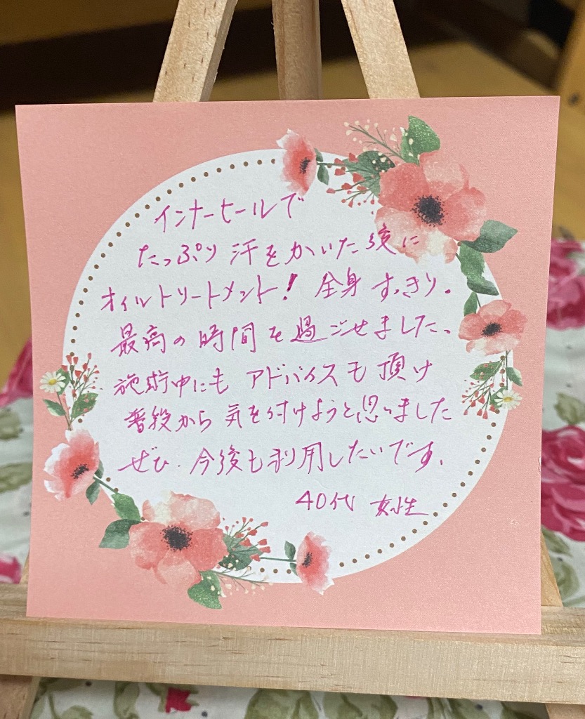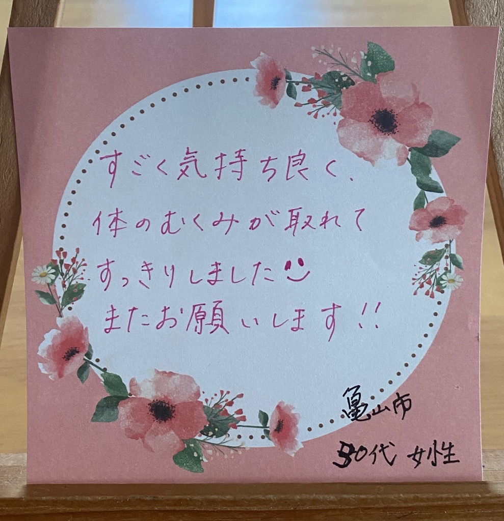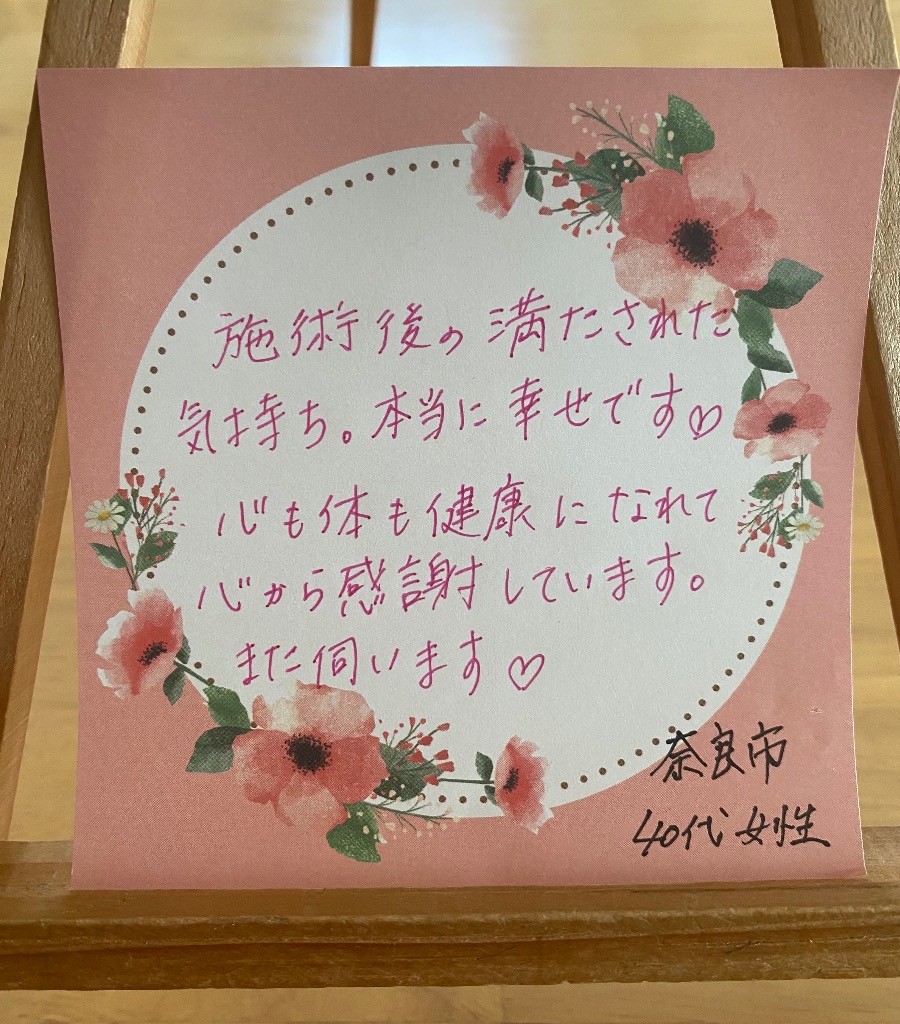 施術後の満たされた気持ち。本当に幸せです❣️心も体も健康になれて心から感謝しています。また伺います❤️奈良県・40代女性