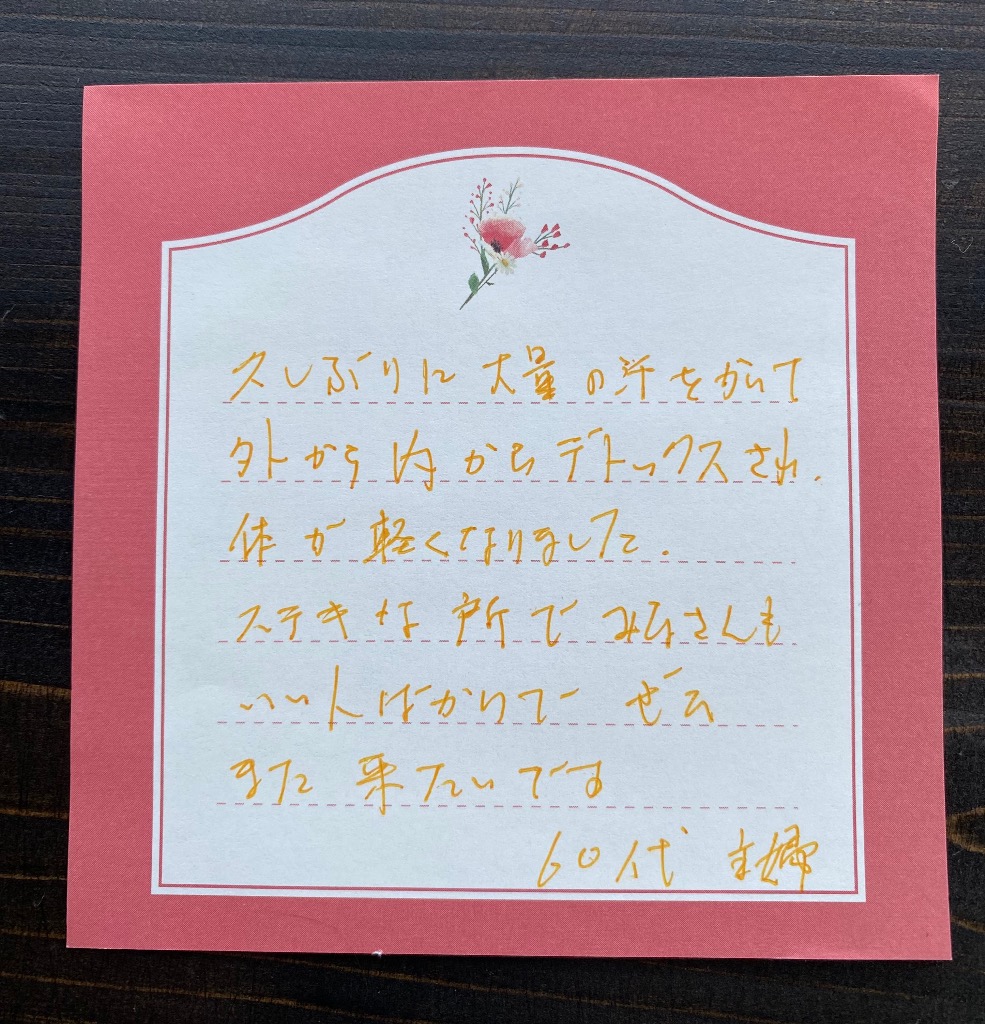 久しぶりに大量の汗をかいて、外から中からデトックスされて体が軽くなりました。ステキな所で皆さんもいい人ばかりで、ぜひまた来たいです❣️60代 主婦