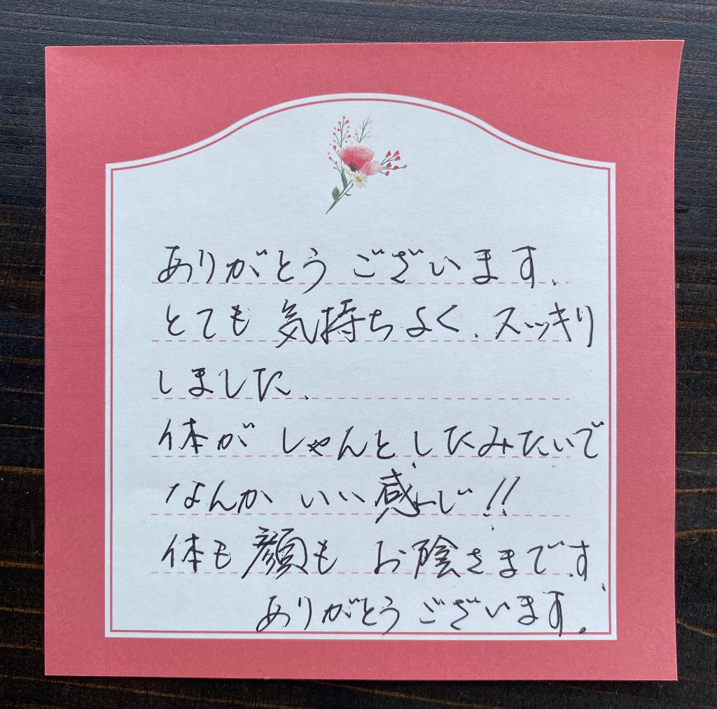ありがとうございます😊とても気持ちよく、スッキリしました!体がしゃんとしたみたいでなんかいい感じ!!体も顔も、お陰さまです♪ありがとうございます。