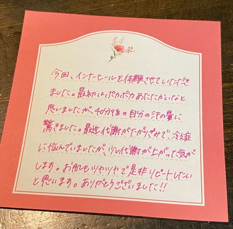 今回、インナーヒールを初めて体験させていただきました。最初はポカポカあたたかいなと思いましたが、40分後の自分の汗の量に驚きました!最近代謝が下がったみたいで、冷え症に悩んでいましたが、少し代謝が上がった気がします。お肌もツヤツヤです❣️是非ピートしたいと思います。ありがとうございました(^-^)!!