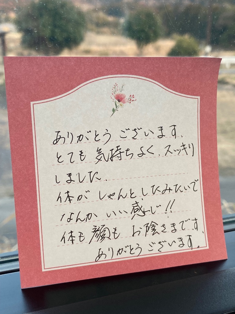 ありがとうございます。とても気持ちよく、スッキリしました😆体がしゃんとしたみたいでなんかいい感じ!!体も顔もお陰さまです♪ありがとうございます❤️