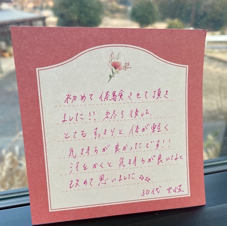 初めて体験させていただきました。普段そんてにシをかかないので、ものっすごーくスッキリしました!体が軽やかになって嬉しいです╰(*´︶`*)╯♡ありがとうございました。30代 女性