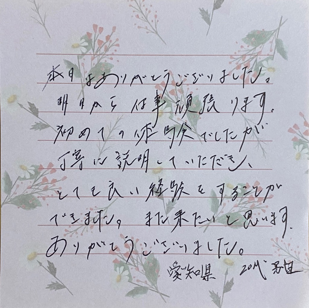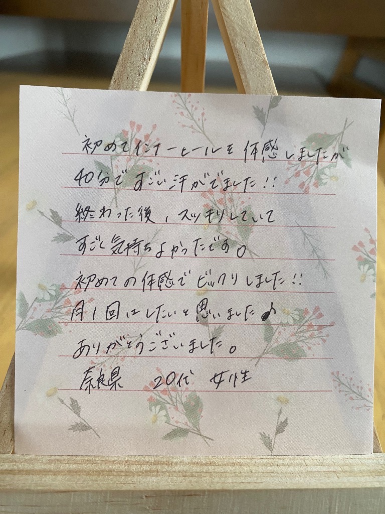 本日はありがとうございました。インナーヒールも全身トリートメントも初めての体験でしたが、丁寧に説明していただき、とても良い経験をすることができました。明日からまた仕事頑張ります!という感じです(^^)また来たいと思います。ありがとうございました。愛知県 20代男性