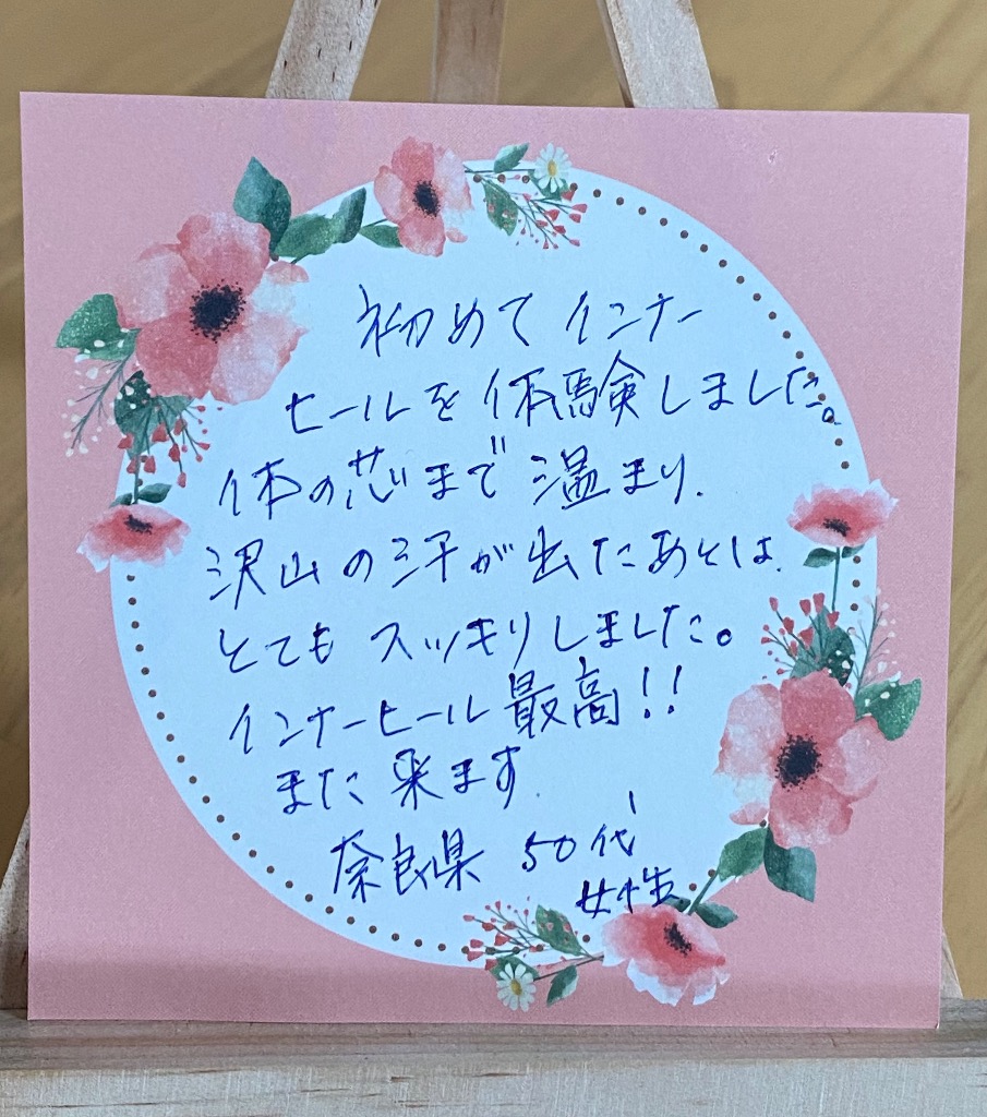 初めてインナーヒールを体験しました。体の芯まで温まり、沢山の汗が出たあとは、とてもスツキリしました。インナーヒール最高!!また来ます✨奈良県 50代女性