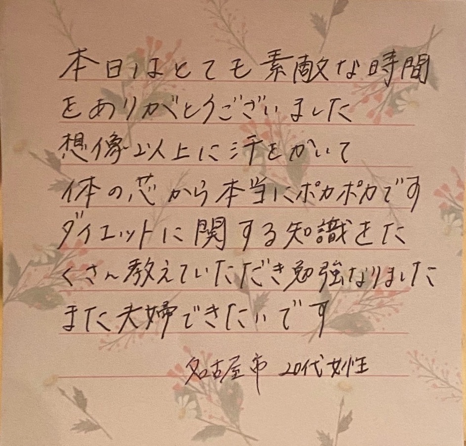 本日はとても素敵な時間をありがとうございました╰(*´︶`*)╯♡想像以上に汗をかいて、体の芯から本当にポカポカです!ダイエットに関する知識をたくさん教えていただき勉強なりました✨また夫婦で来たいです❤️名古屋市 20代女性