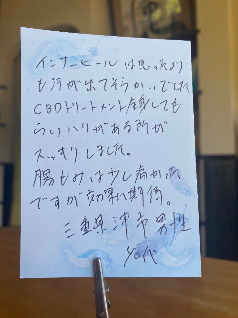 インナーヒールは思ったよりも汗が出て爽快でした!!CBDトリートナントも全身してもらい、筋肉が張っていた所がスッキリしました。腸もみは少し痛かったですが効果期待!三重県津市 40代男性