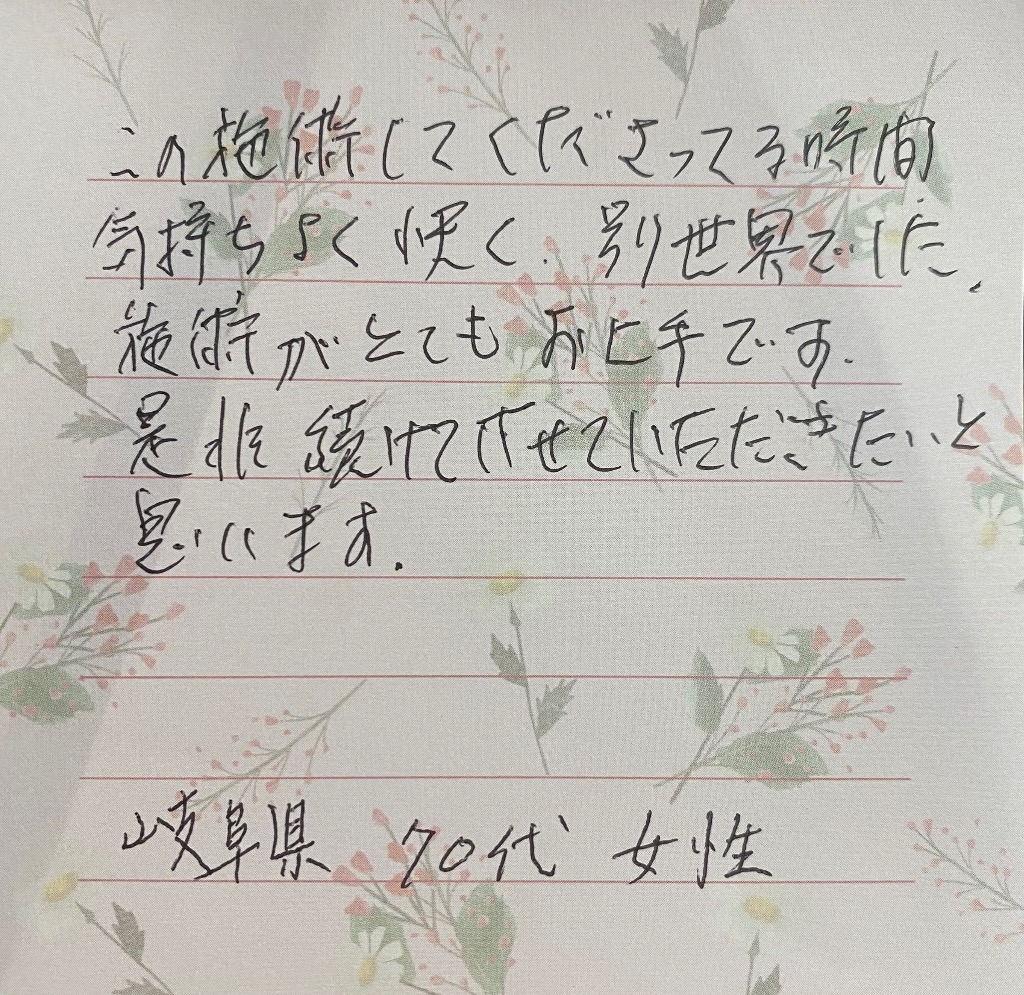このインナーヒールと小顔エステ、CBDトリートメント施術してくださっている時間、気持ちよく快く、別世界でした♡施術がとてもお上手です♪是非続けさせていただきたいと思います!岐阜県 70代 女性