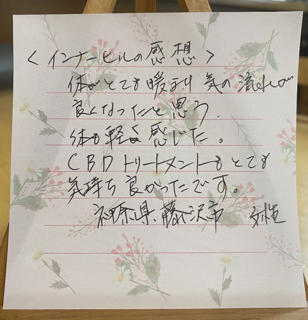 <インナーヒールの感想>体がとても暖まり気の流れが良くなったと思う。体も軽く感じた。CBDトリートメントもとです気持ち良かったです。神奈川県務沢市 女性