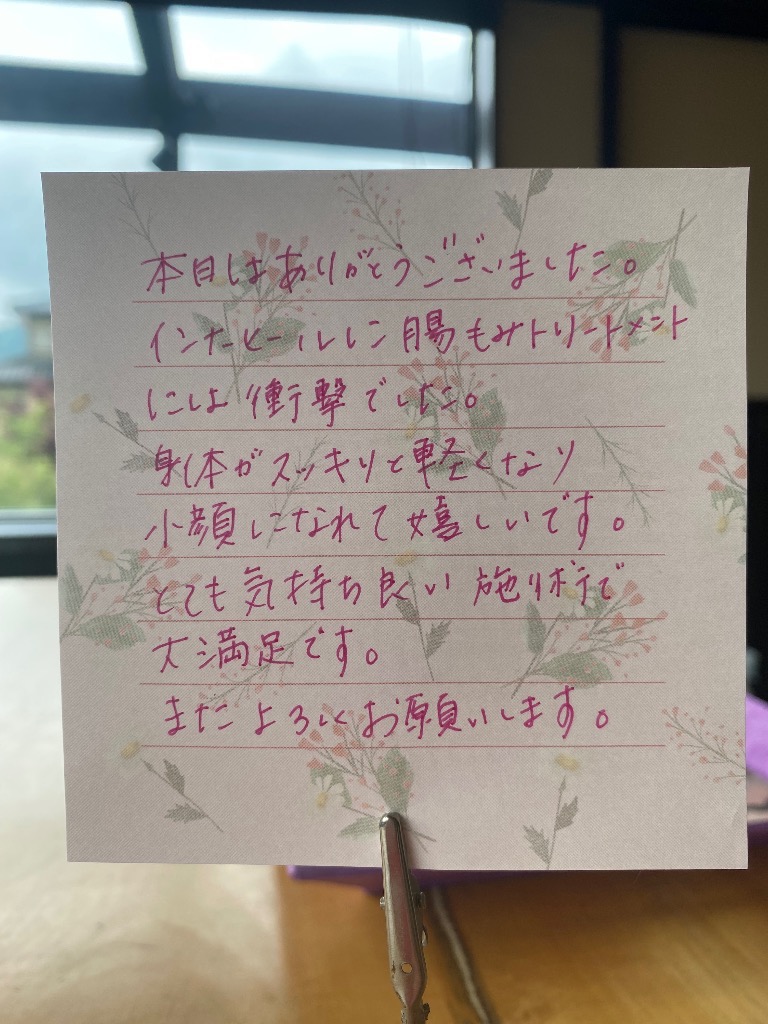 本日はありがとうございました╰(*´︶`*)╯♡インナーヒールに腸もみトリートメントには衝撃でした!身体がスッキリと軽くなり小顔になれて嬉しいです♪とても気持ち良い施術で大満足です‼️またよろしくお願いします。鈴鹿市 50代女性